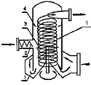 1、熱風(fēng)分配器 2、螺旋加料器 3、攪拌器 4、分級(jí)器 5、旋轉(zhuǎn)干燥室